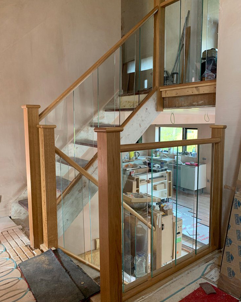 Depending on your preference, setting and your budget, you can choose easy to install glass balustrade panels attached with glass clamps (glass bracket stairs) or fully embedded glass panels, which sit seamlessly within the base rails with no gaps. You may wish to opt for a sleek, glass banister or opt for oak handrails that can be natural or painted to match your décor.